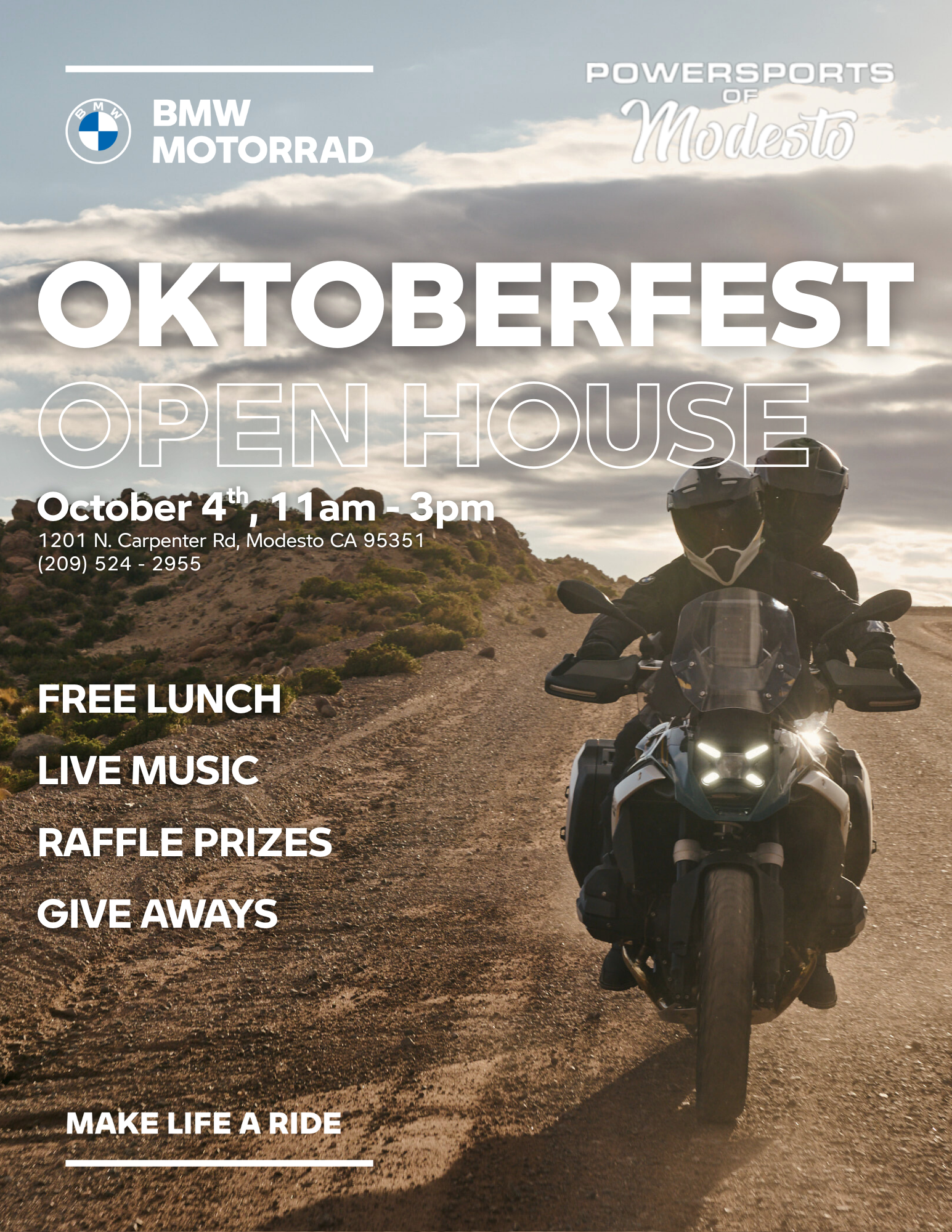 Join BMW Motorcycles of Modesto for BMW Oktoberfest on Saturday, October 4, from 11 AM to 3 PM at Powersports of Modesto! We’ll have bratwursts on the grill, raffle prizes, and live music by Tony & The Tuff Times. Explore vendor booths—featuring Russ Brown Motorcycle Attorneys, Kona Ice, and local makers. Family-friendly and free to attend!